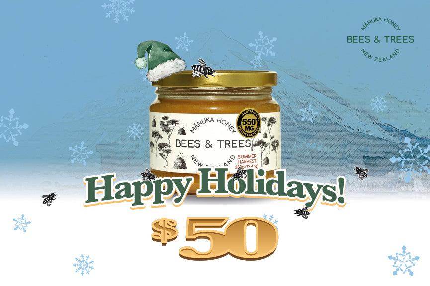 Our Digital Gift Cards are the perfect way to share delicious and authentic New Zealand MÄnuka and Native honeys. We've made it easy to buy and use! Available in $50 and $100 values.Ā If you would like to gift someone a Bees & Trees gift card, please forward the email to the recipient. *GiftĀ cards are not included in any coupon codes and are excluded from our subscription service.